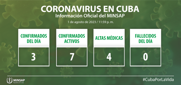 De 1 millón 115 mil 067 pacientes diagnosticados con la enfermedad, se mantienen ingresados 7 activos, todos con evolución clínica estable. Se acumulan 8 mil 530 fallecidos (0 en el día), letalidad de 0,76% vs 1,0% en el mundo y 1,53% en las Américas; dos evacuados, 57 retornados a sus países, en el día hubo 4 altas, se acumulan 1 millón 106 mil 471 (99,2%).