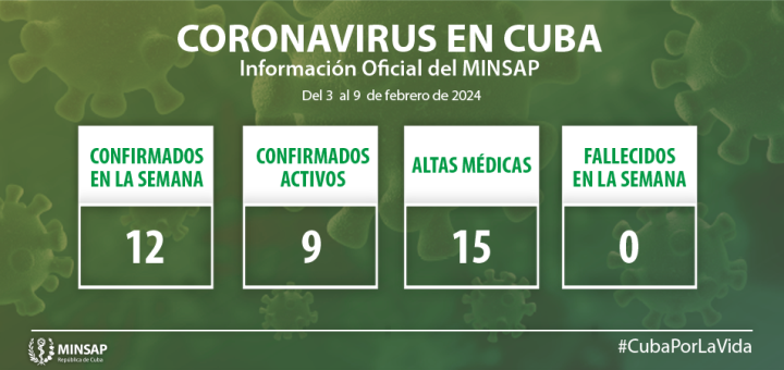 Del millón 115 mil 235 pacientes diagnosticados con la enfermedad 9 se mantienen ingresados activos. Se acumulan 8 mil 530 fallecidos (ninguno en la semana). En la semana hubo 15 altas, acumulándose 1 millón 106 mil 635. No se reportan pacientes graves, ni críticos confirmados en las Unidades de Cuidados Intensivos del país.
