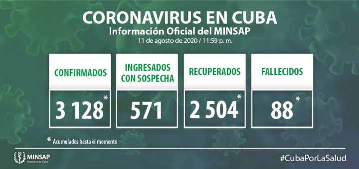 Al cierre del día de ayer se confirman 35 casos nuevos, con un acumulado de 3 mil 128 en el país. De los 3 mil 128 pacientes diagnosticados con la enfermedad, se mantienen ingresados confirmados 534 (17,1%), 528 el 98,9% con evolución clínica estable. Se reportan 88 fallecidos (ninguno del día), dos evacuados, 32 altas del día, se acumulan 2 mil 504 pacientes recuperados (80 %). Se reportan 2 pacientes en estado crítico y cuatro en estado grave.