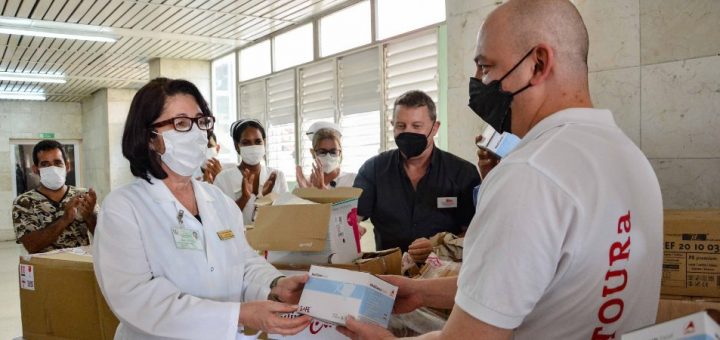 Mascarillas, batas, jeringuillas y guantes fueron algunos de los insumos médicos que entregó hoy la Agencia de Turismo Aventoura GmbH de Alemania al Hospital Clínico Quirúrgico Miguel Enríquez, de esta capital, como parte de un donativo para apoyar al Sistema Nacional de Salud.